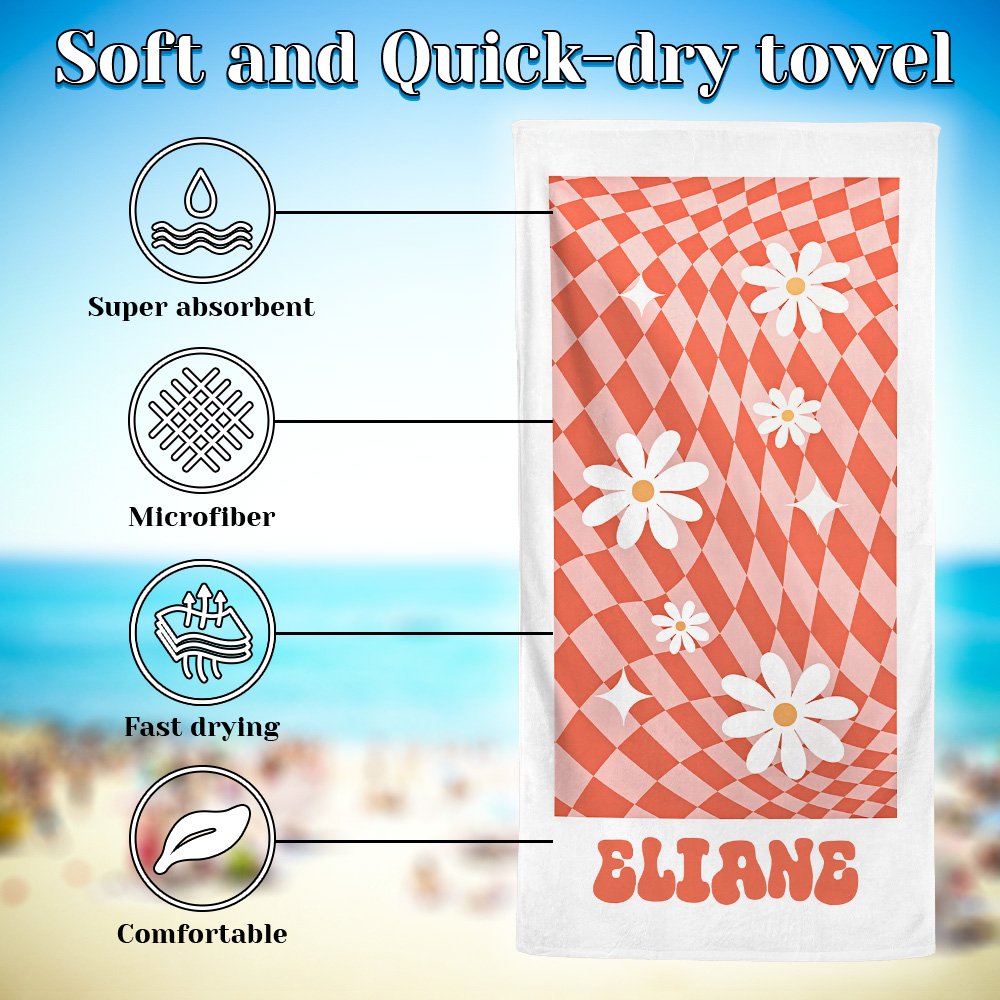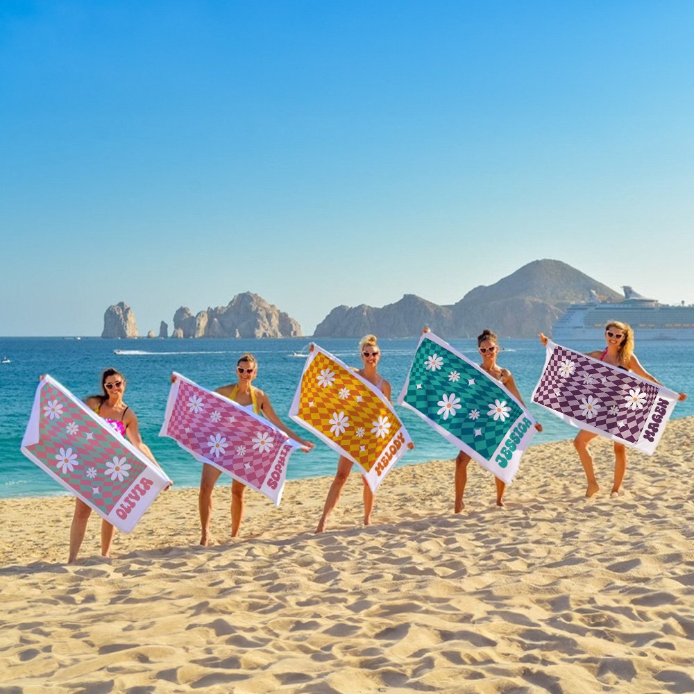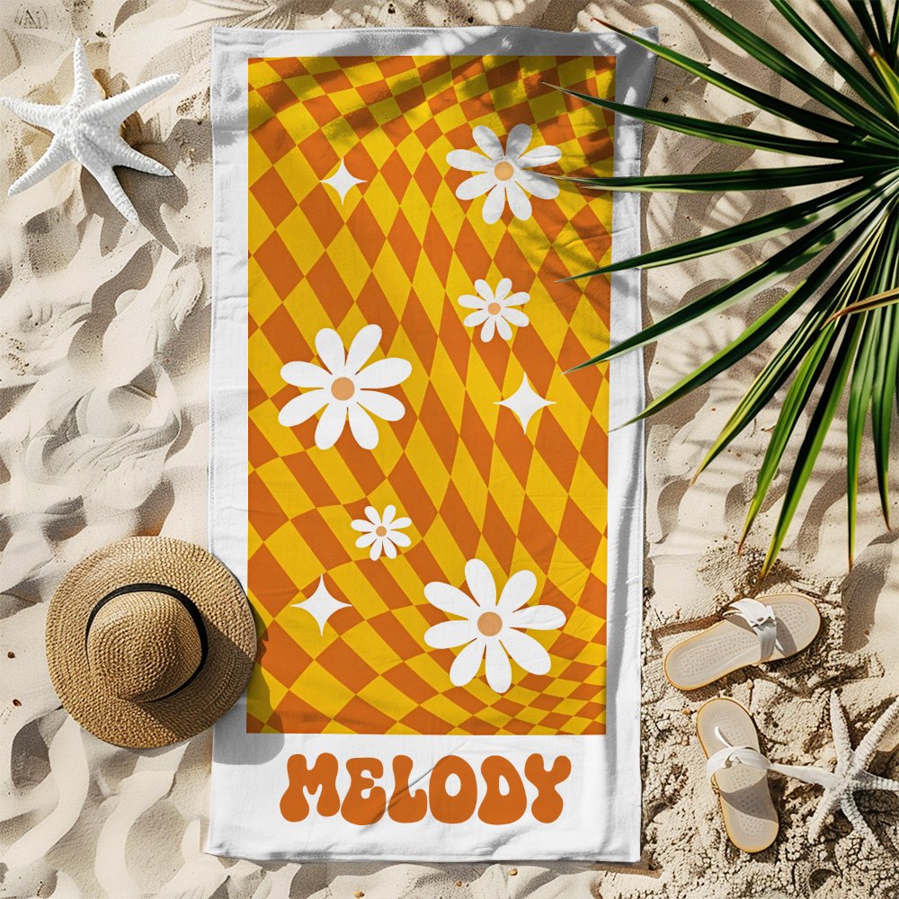 Esta toalla de playa presenta un fondo de cuadros escoceses clásicos impregnado de vibrantes elementos de margaritas, que reflejan el animado espíritu de los años setenta. Ofrecemos seis opciones de color para que elijas, lo que te permite personalizarla con tu nombre y mostrar tu estilo único.