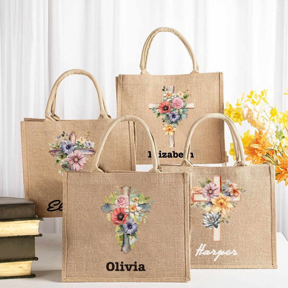 Este espacioso bolso de yute presenta un diseño personalizable de 1-5 flores de cumpleaños rodeando una cruz y personalizado con un nombre especial. Perfecta para añadir un toque personal a tu regalo y hacerlo realmente único.