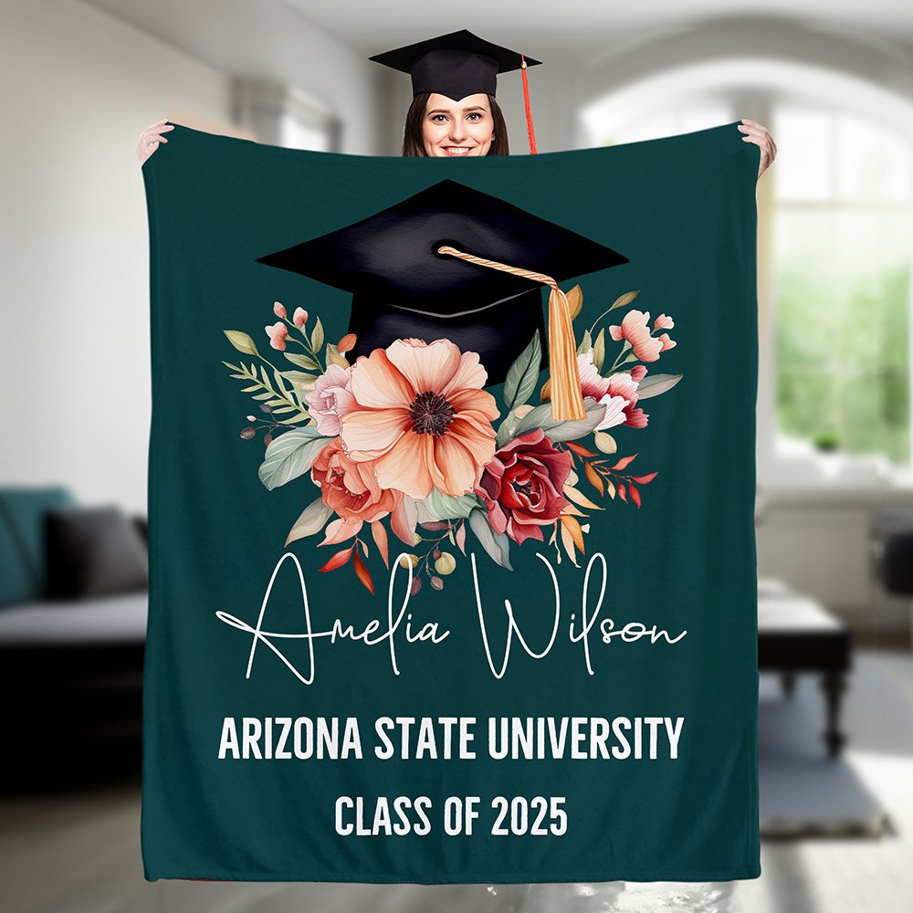 Este producto está diseñado para graduados, combinando elegantes elementos florales de acuarela con motivos de birretes de graduación que simbolizan los logros académicos, mostrando la belleza de la juventud y la gloria del crecimiento. La manta no sólo está impresa con exquisitos adornos florales, sino que también tiene 3 estilos para elegir. Puede añadir su nombre, año de graduación, nombre de la escuela, etc., haciendo de esta manta un recuerdo único para dejar constancia de este importante hito en su vida.