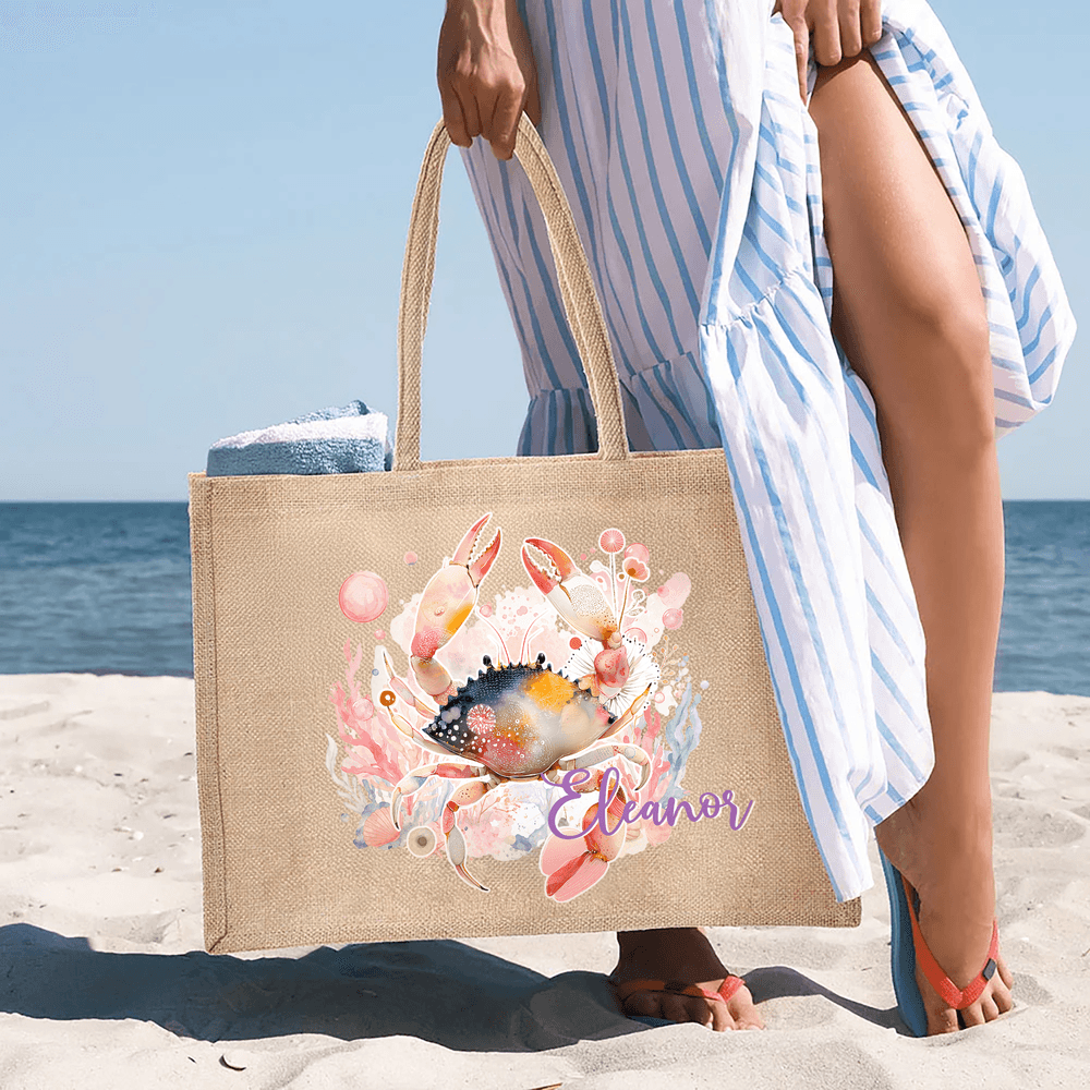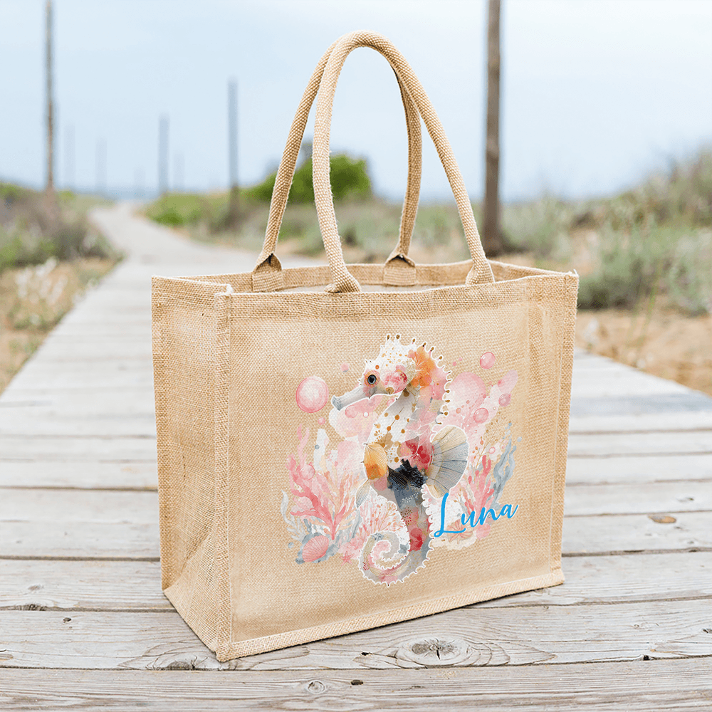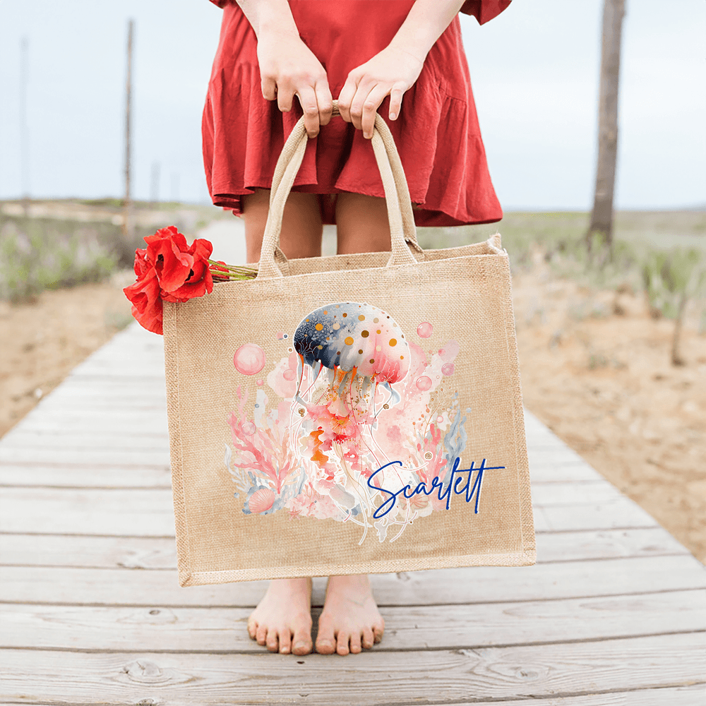 Esta bolsa de yute presenta elementos marinos de ensueño con técnicas de acuarela. y se combina con motivos de criaturas marinas de dibujos animados especialmente diseñados. Cada detalle desprende una atmósfera libre y romántica. Añade una personalización única con tu nombre para crear una bolsa con un sello personal.