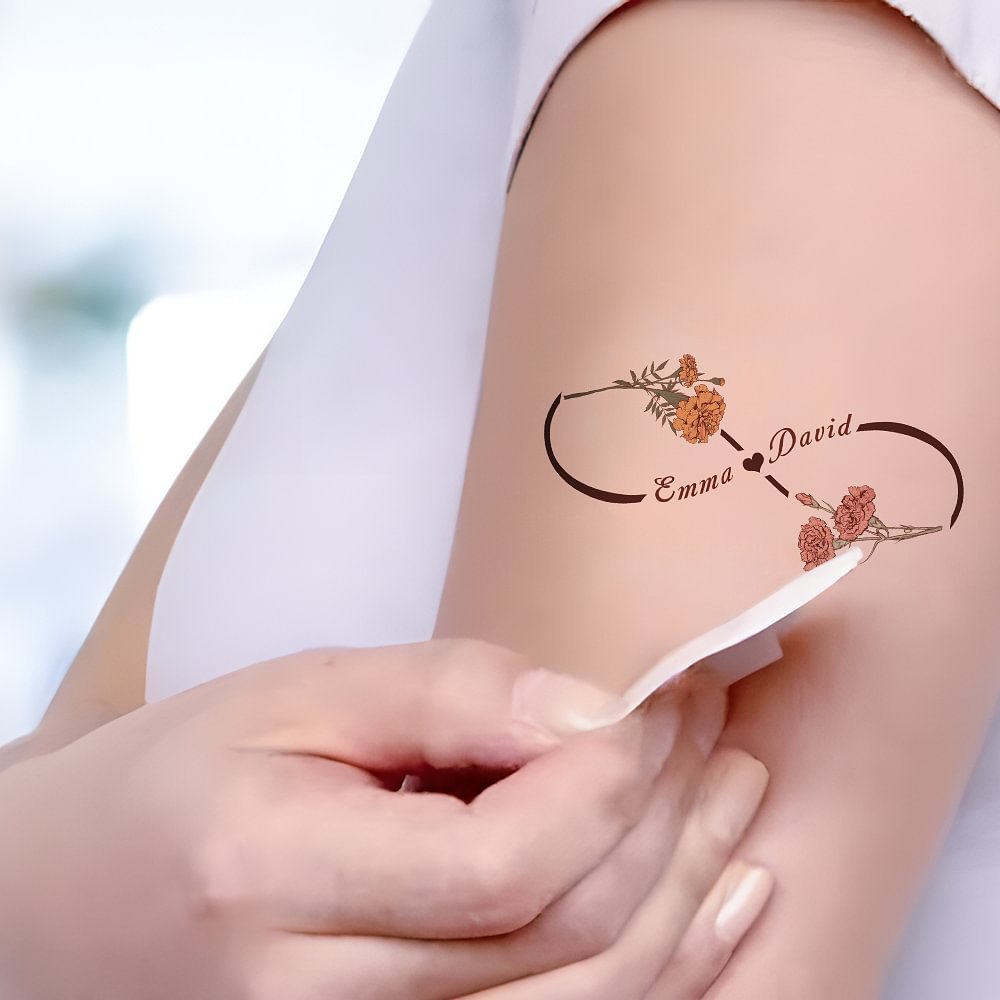 Este adhesivo para tatuajes presenta un símbolo de infinito a todo lo ancho entrelazado con flores de nacimiento, lo que te permite personalizarlo con nombres y flores que resuenen contigo y con tus seres queridos. Los nombres y las flores de nacimiento fluyen con elegancia a lo largo de un grácil arco, mientras que el símbolo del infinito representa la eternidad, susurrando suavemente: "Conocerte no tiene fin". Este diseño personalizado impregna cada adhesivo de tatuaje de una emoción y un significado únicos.