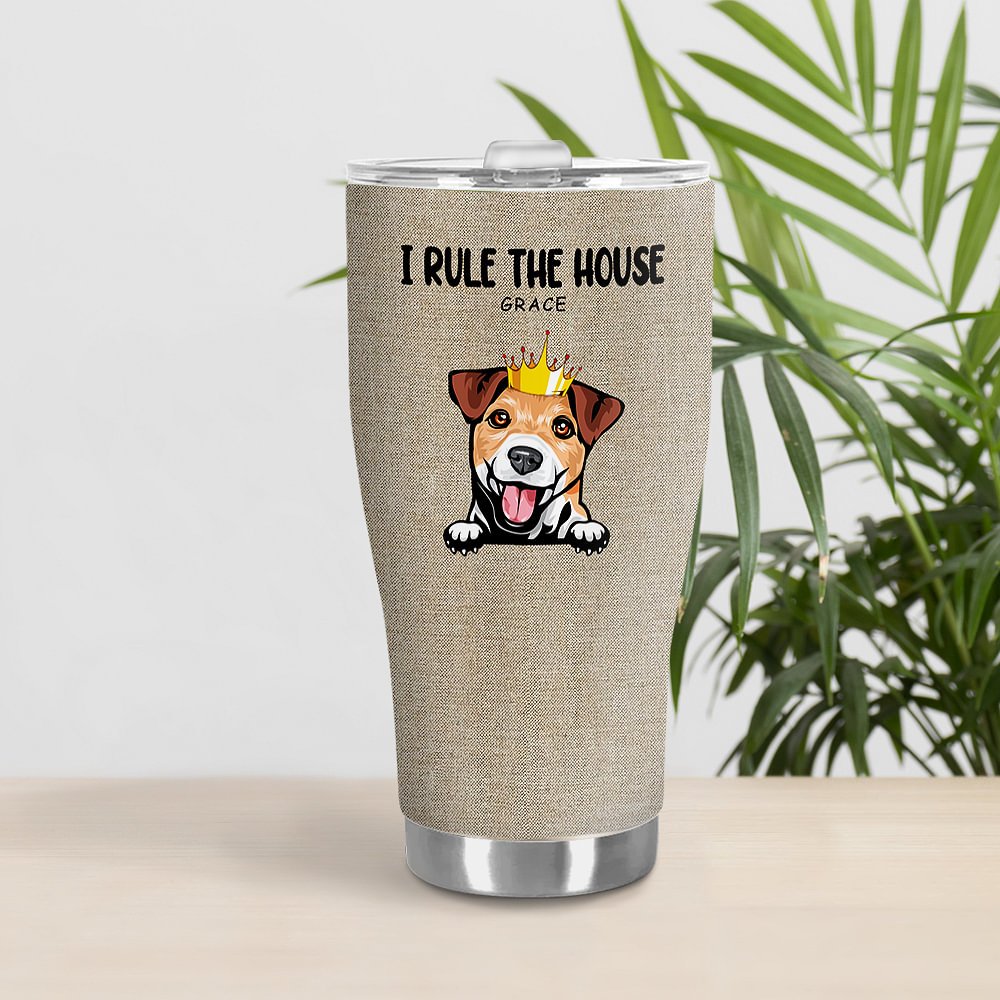 La parte frontal del vaso curvo está impresa con un simpático diseño de un gato y un perro, y el eslogan "I/We Rule The House" es una forma ingeniosa y divertida de añadir un toque de calidez al vaso.