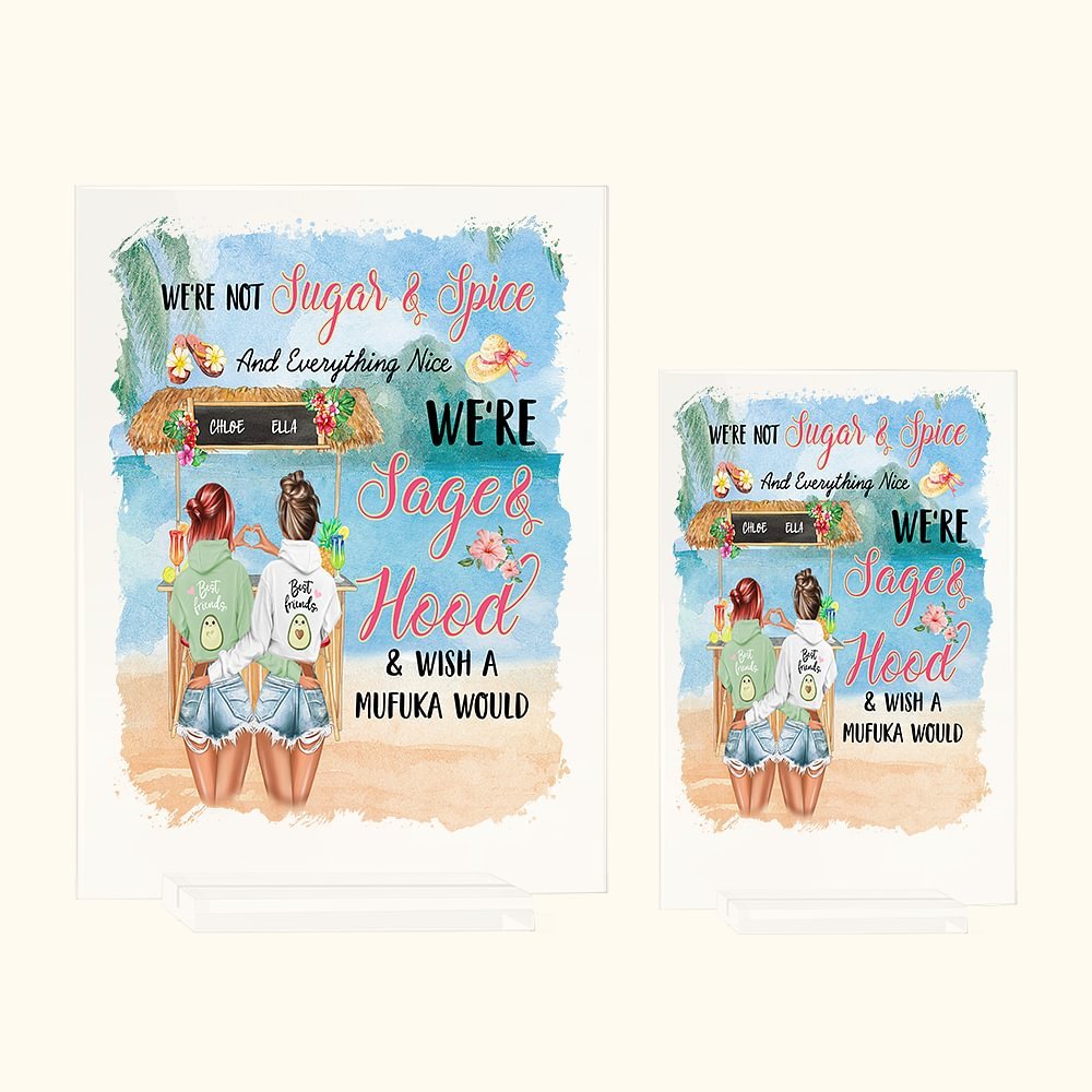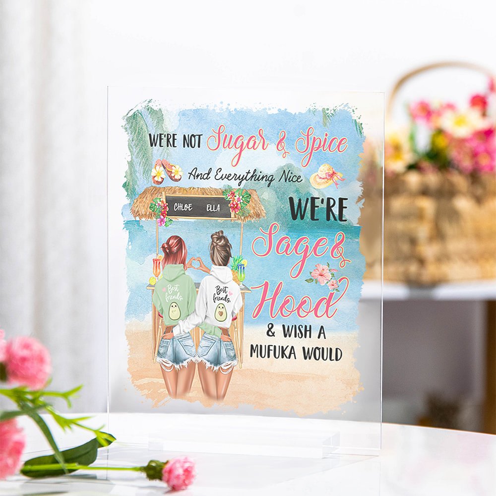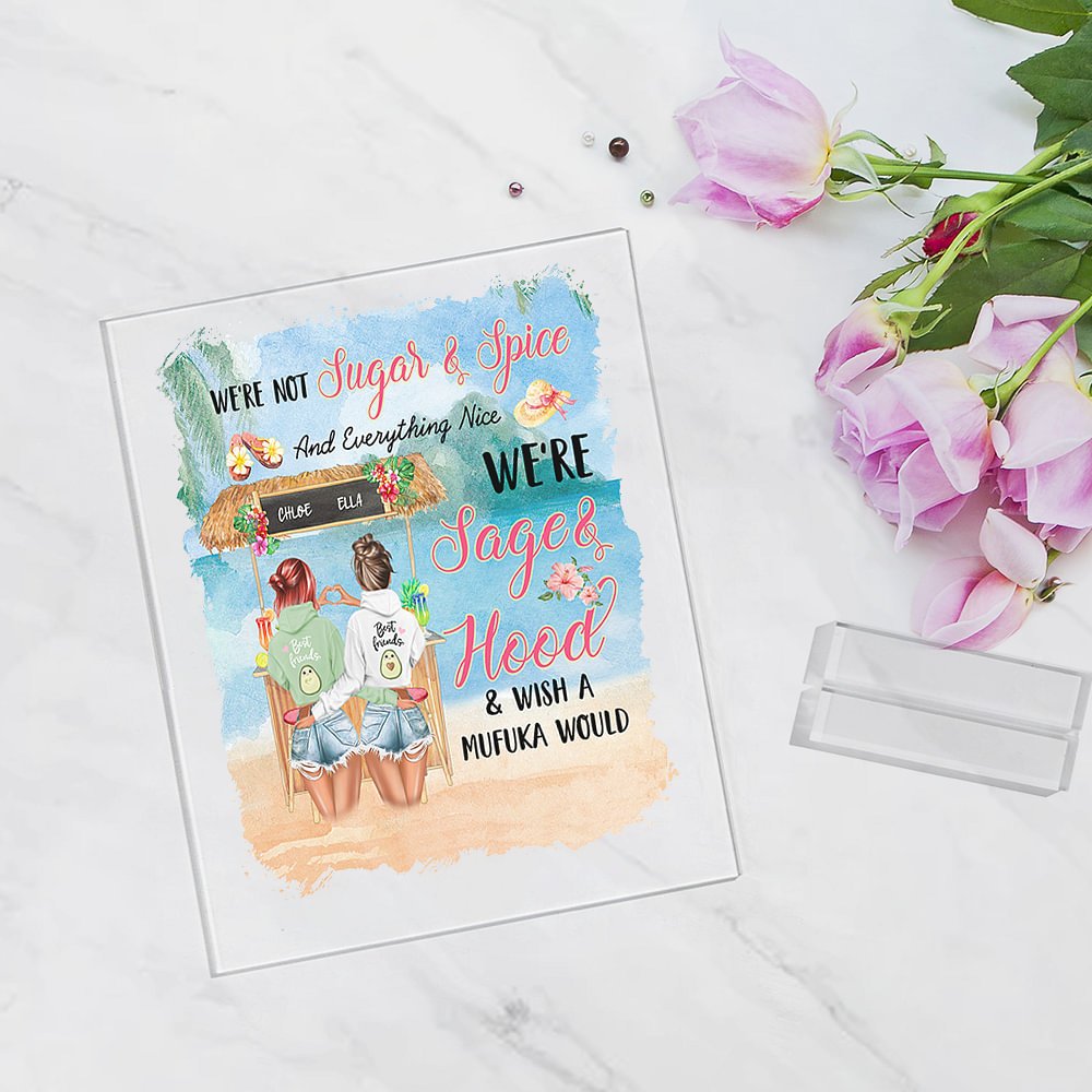 La frase "No somos azúcar y especias y todo lo bonito, somos sabio y capucha y desearía que un mufuka" está audazmente grabada en la parte delantera para mostrar la fuerza, la honestidad y la naturaleza a veces traviesa de la verdadera amistad. Puedes diseñar imágenes y nombres personales, este es el regalo de amistad y adorno de escritorio perfecto que celebra el vínculo único que compartes con tu mejor amigo.