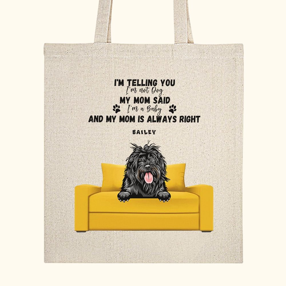 Esta bolsa presenta un diseño único y llamativo que muestra de 1 a 6 simpáticas mascotas con la divertida frase "We're telling you we're not dogs/cats/pets our mom said we're babies and our mom is always right / I'm telling you i'm not dogs/cats/pets my mom said i'm a babyand my mom is always right". Cada mascota está cariñosamente ilustrada con encantadores detalles, desde sus curiosas expresiones hasta su esponjoso cuerpo. Los vibrantes colores y los caprichosos dibujos añaden un toque de alegría y calidez.
