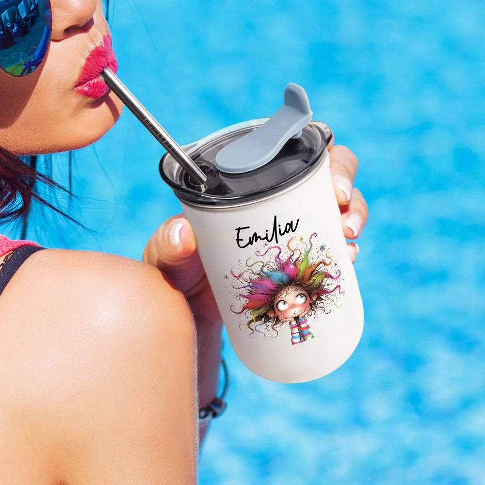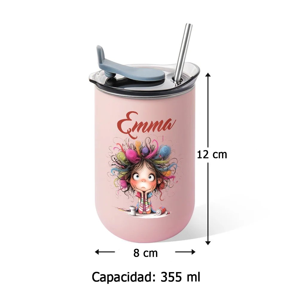 Vaso térmico personalizado 355 ml con nombre y diseño de chica original con tapa abatible y pajita regalo de cumpleaños y fiestas para mujeres y niñas