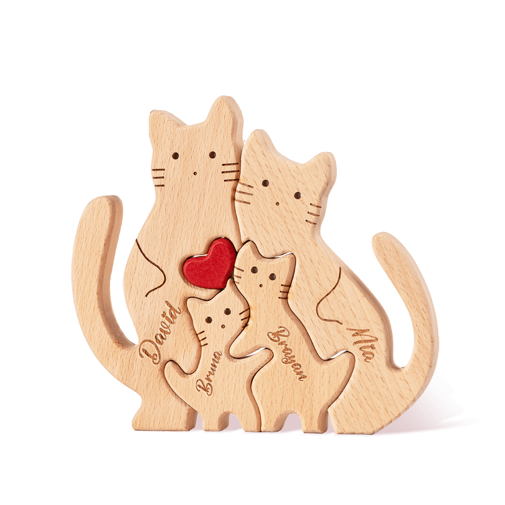 Este rompecabezas de madera presenta gatos abrazados con un corazón rojo en el centro, símbolo de una familia amorosa. Puedes personalizar de 2 a 7 gatos, cada uno con un nombre, para recordar que es el amor y el apoyo lo que une a tu familia en los buenos y en los malos momentos.