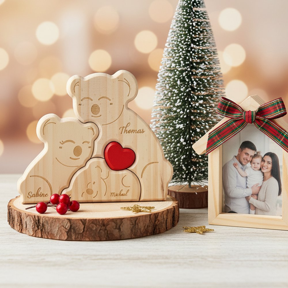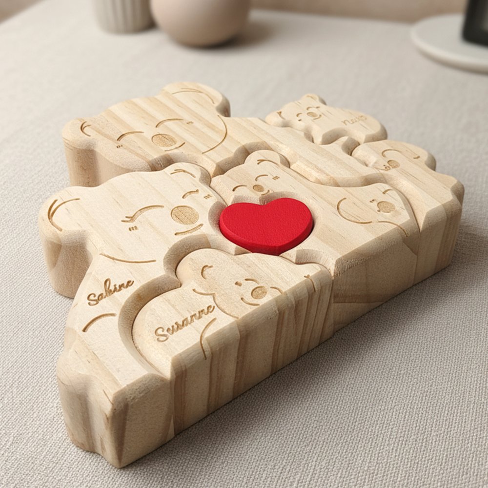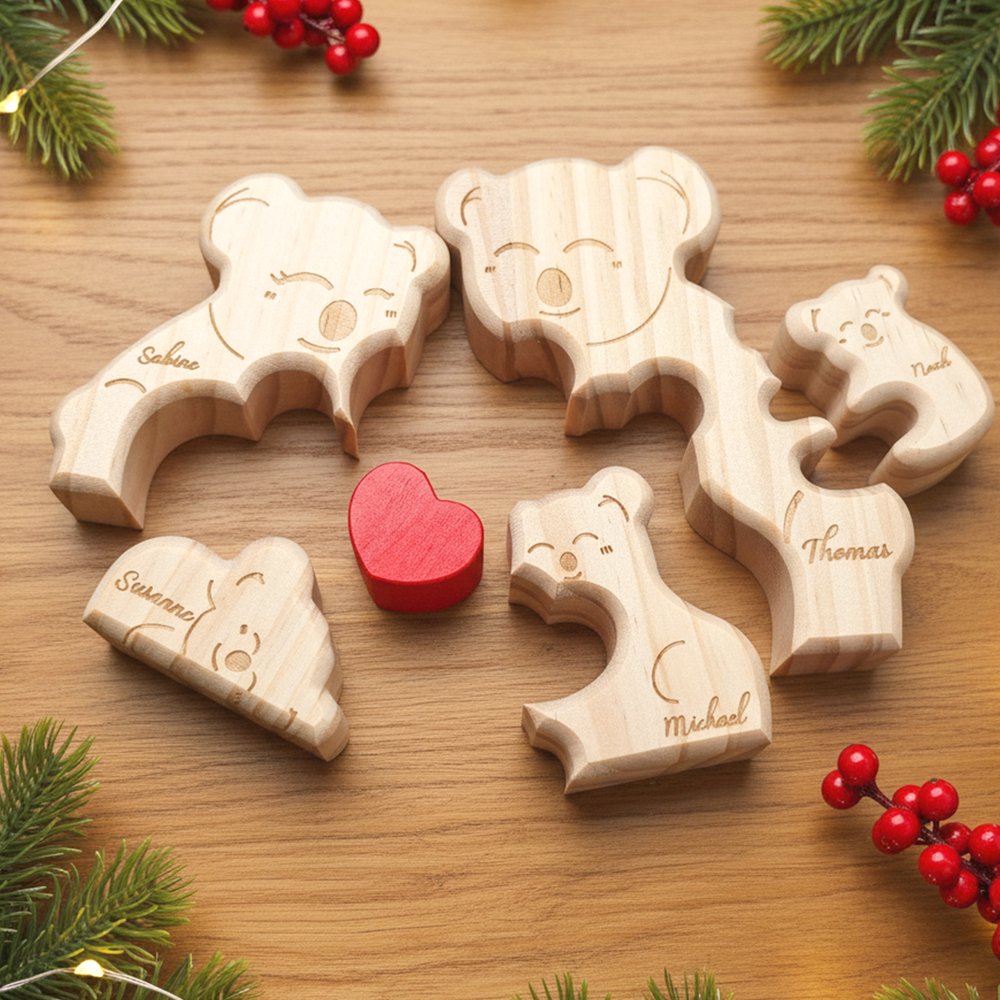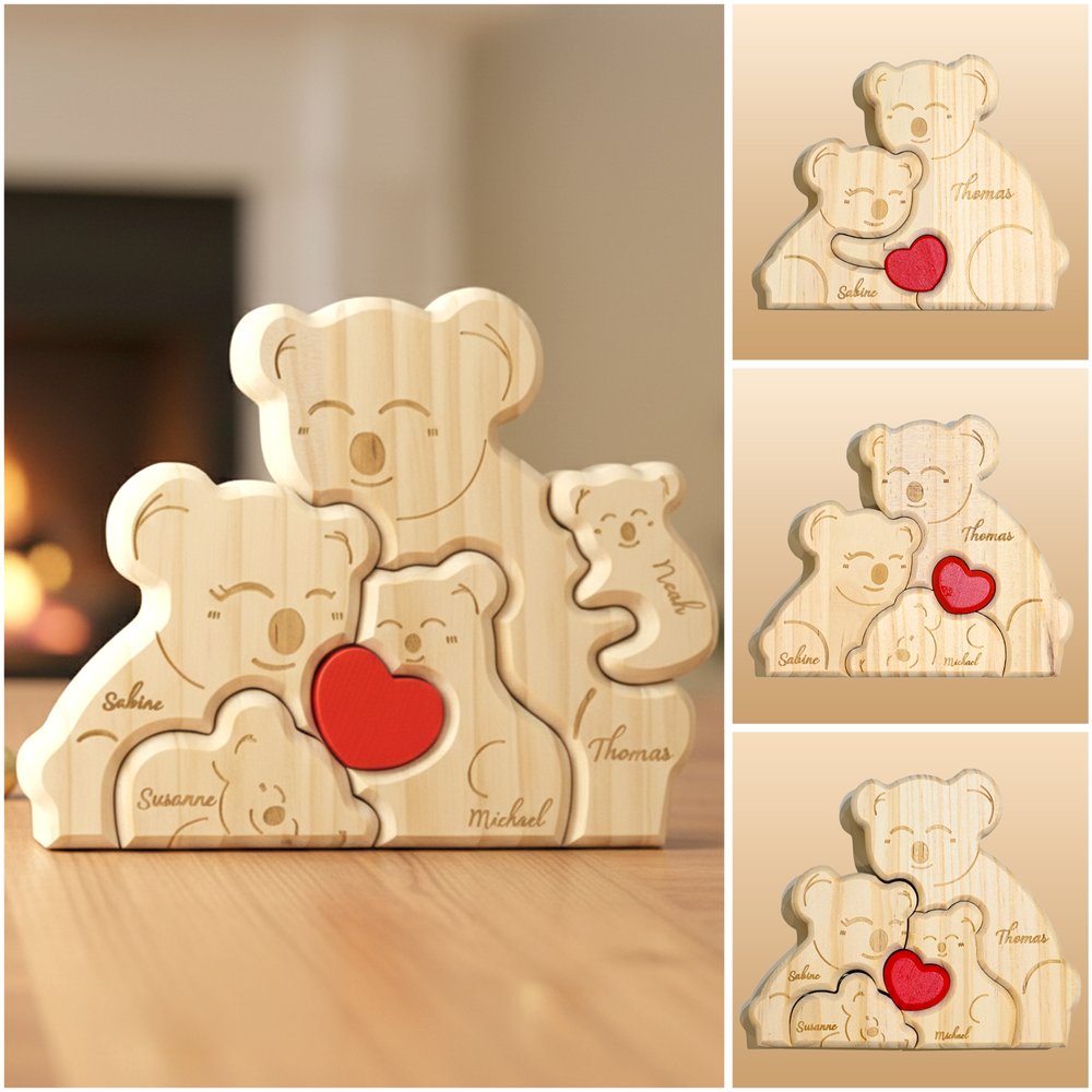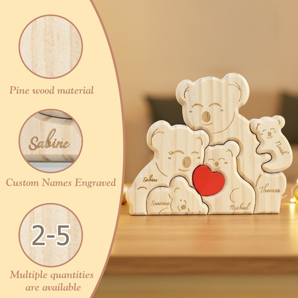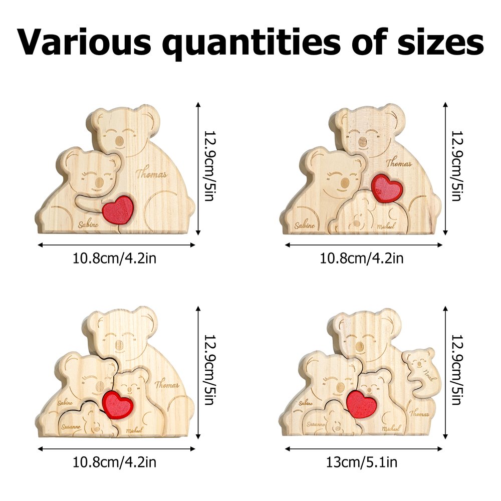 El diseño de este rompecabezas está basado en el tema de los koalas. Puedes elegir una combinación de 2 a 5 koalas según el número de miembros de la familia. Los nombres de los miembros de la familia se pueden personalizar para cada koala. Los koalas se acurrucan juntos, simbolizando la intimidad y el calor de la familia. El amor rojo en el centro representa el amor entre los miembros de la familia.