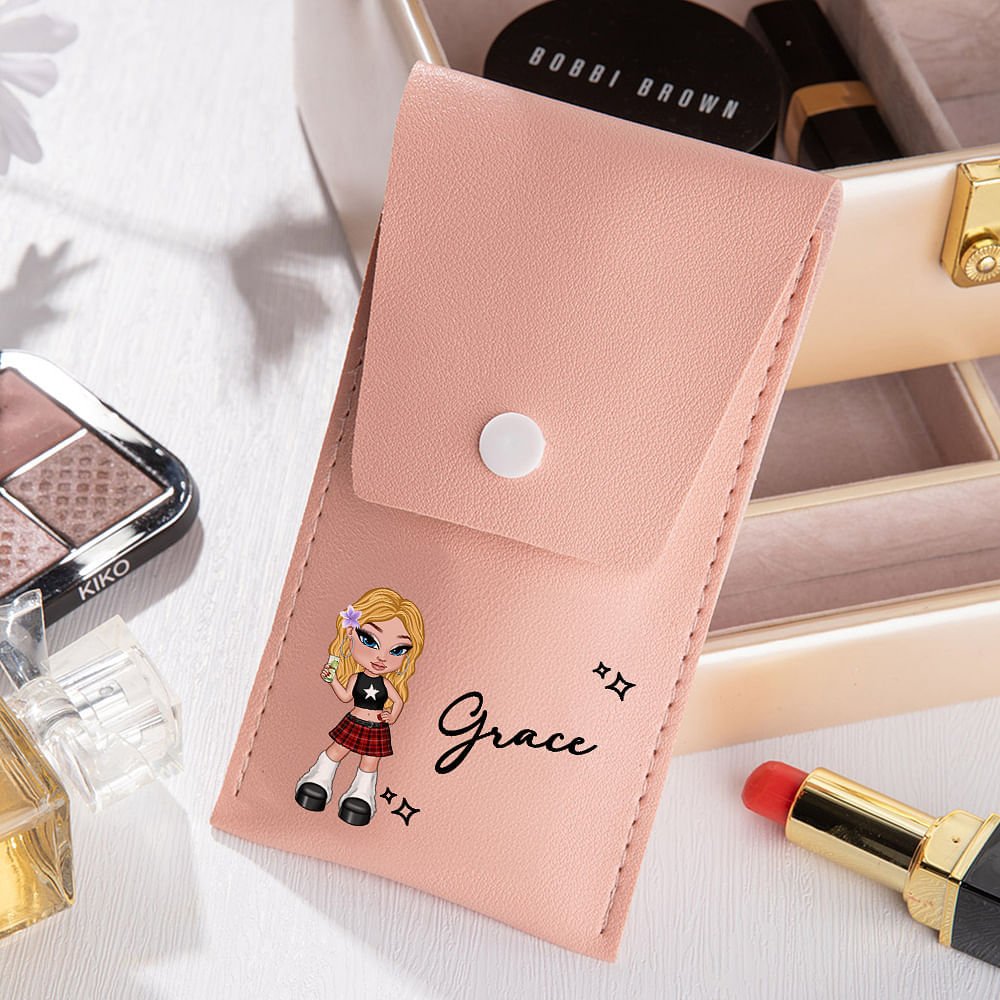 Este estuche para brochas de maquillaje puede personalizarse con una chica de dibujos animados al estilo Y2K y su nombre, creando un regalo moderno y significativo.