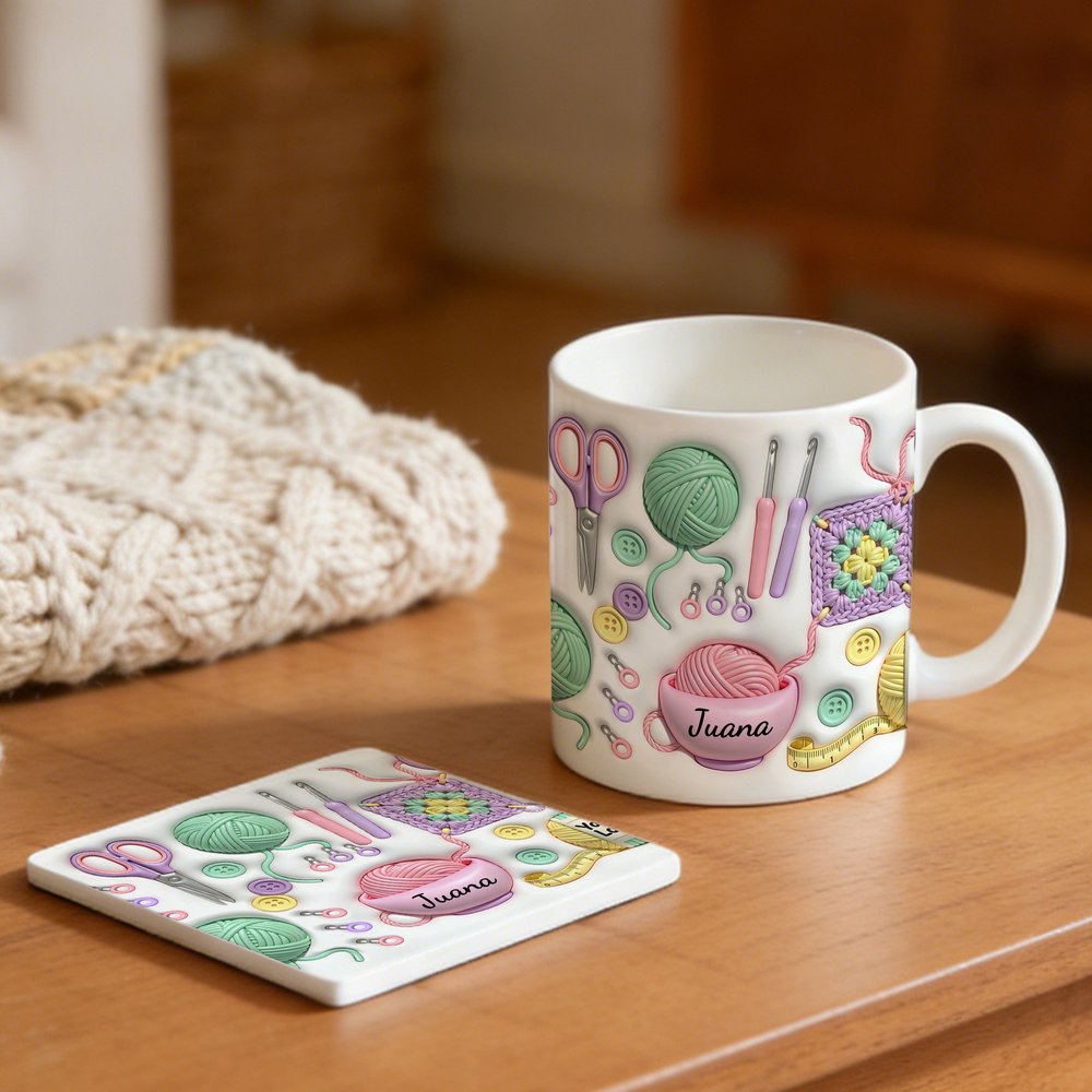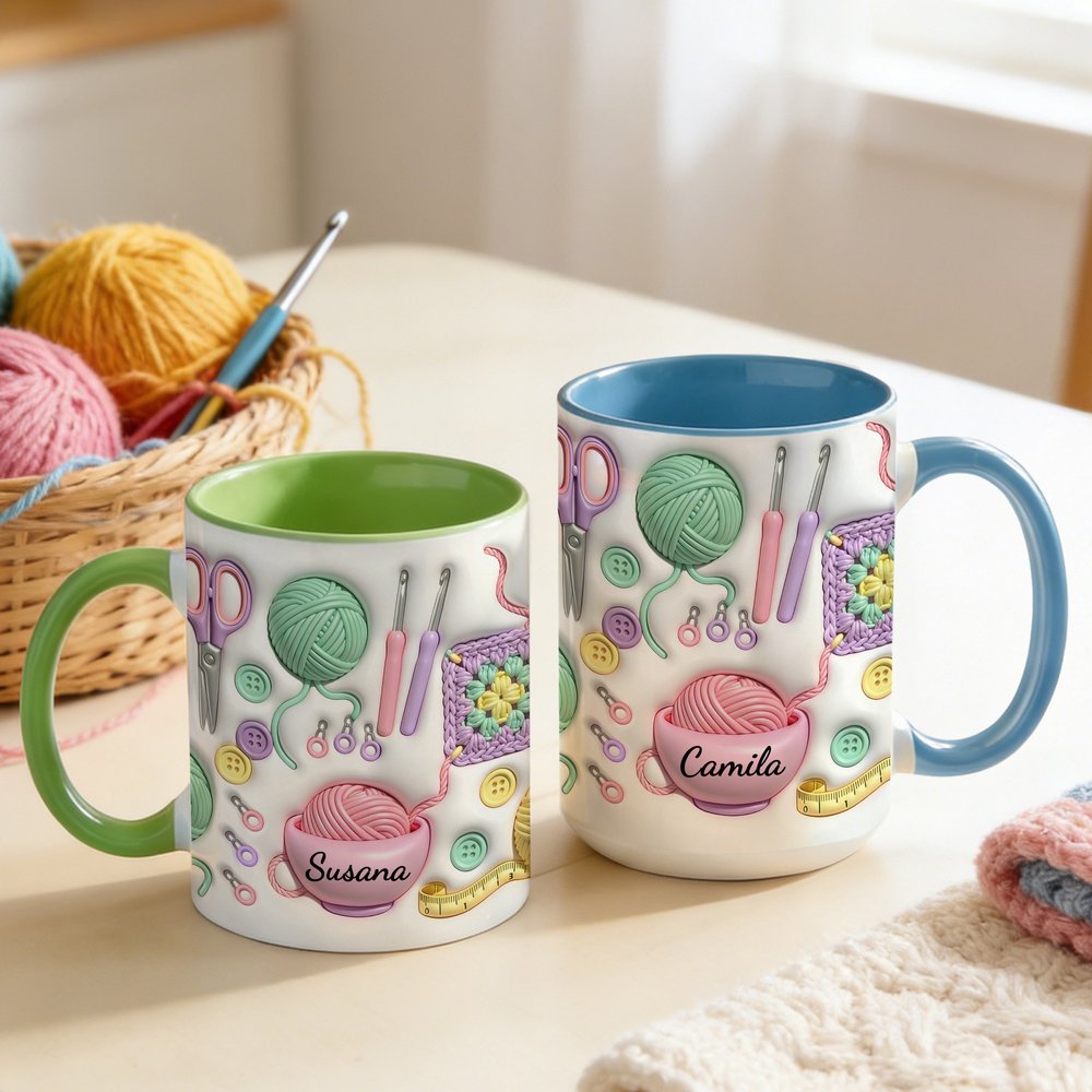 Esta taza da vida al encanto del tejido con elementos visuales en 3D: ovillos de lana coloridos, ganchillos, tijeras y botones, todo en tonos suaves y refrescantes. Personalízala con tu nombre y elige entre 325 ml o 445 ml. Combina perfectamente la calidez de lo artesanal con la funcionalidad diaria, convirtiendo cada taza en un emblema personal para las amantes del punto. Más que un recipiente, es un recuerdo entrañable que celebra tu pasión.