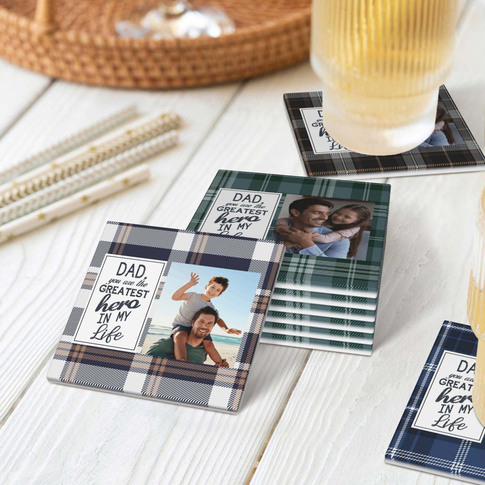 Estos posavasos presentan un diseño de cuadros escoceses de búfalo en 7 opciones de color, añadiendo un encanto clásico y vintage. El sincero mensaje "Papá, eres el mayor héroe de mi vida" celebra el vínculo especial entre tu padre y tú. También puedes personalizarlos subiendo una foto para conservar recuerdos entrañables.