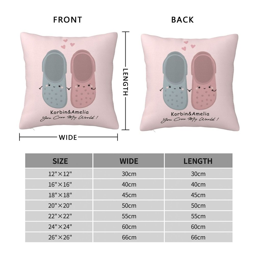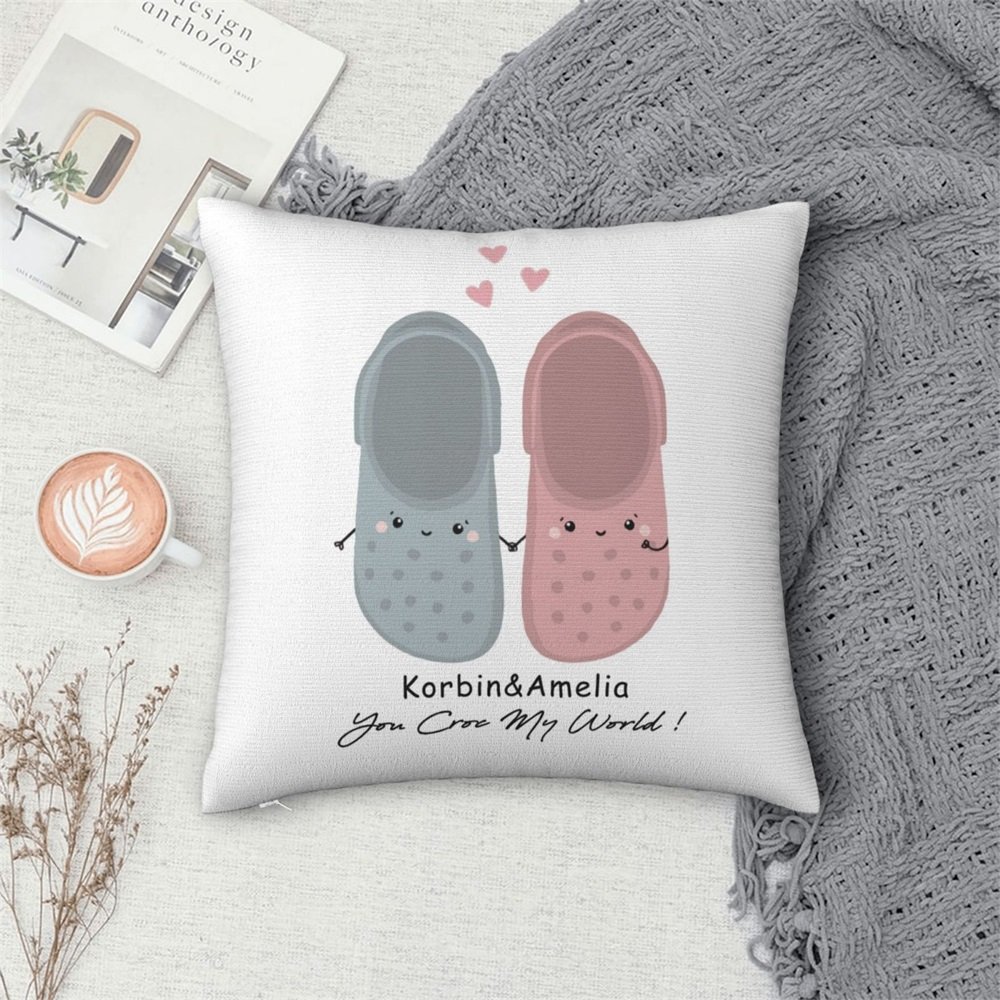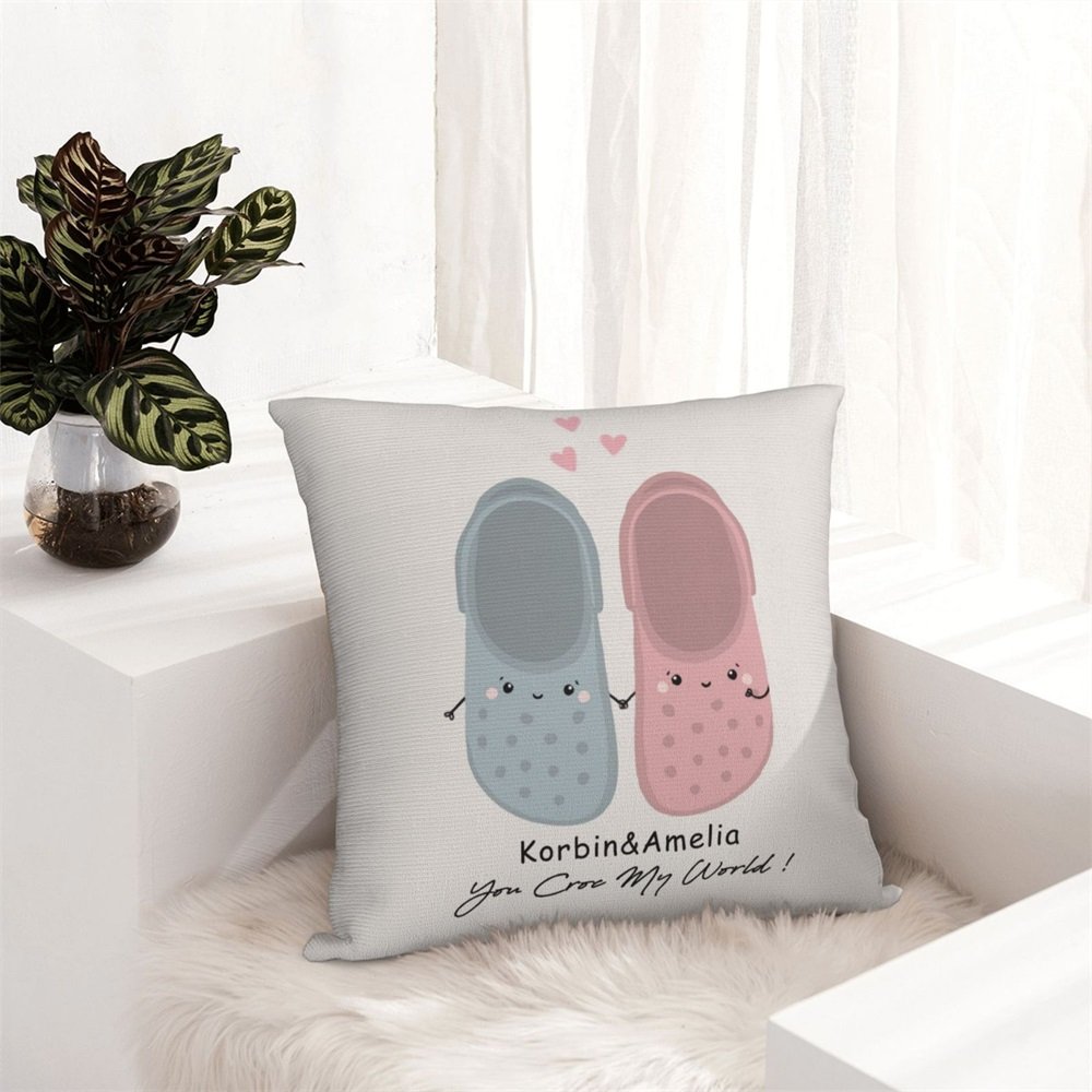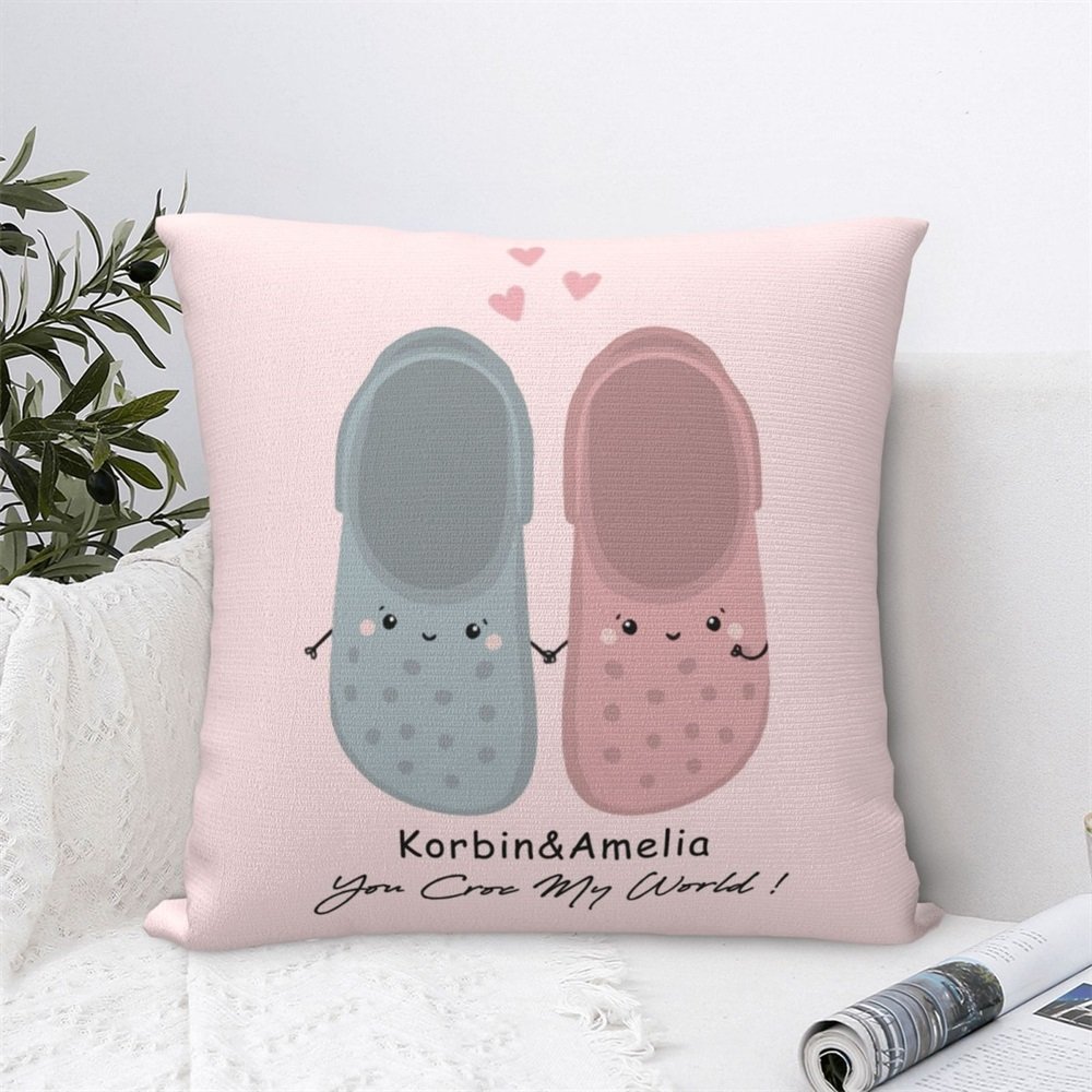 Elaborada con cariño y atención al detalle, la funda de almohada presenta una entrañable ilustración de dos adorables zapatillas, cogidas de la mano juguetonamente. El simpático diseño se completa con el juego de palabras "you croc my world". El caprichoso diseño añade un toque de encanto a cualquier espacio, haciendo de esta funda de almohada una pieza destacada en cualquier habitación.