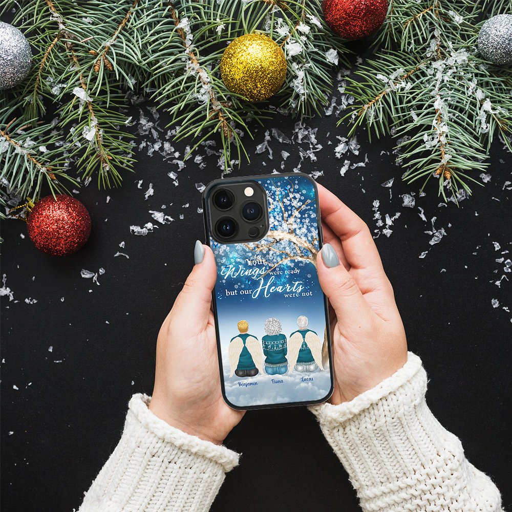 Uniquely designed, this phone case features a charming scene combined with a Christmas element that shows a heartwarming image of family and friends spending time together. With the addition of "Your Wings Were Ready But Our Hearts Were Not" and a personalized message, it will be a special keepsake that celebrates the everlasting love between people.