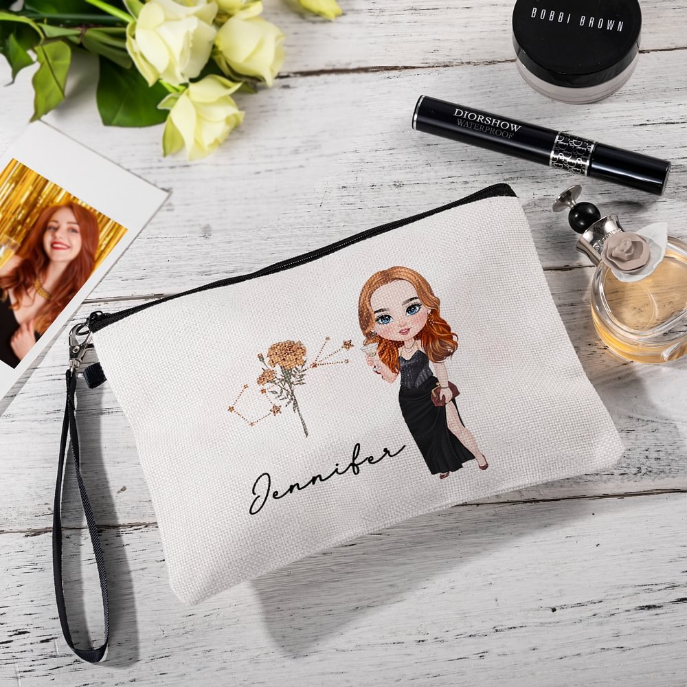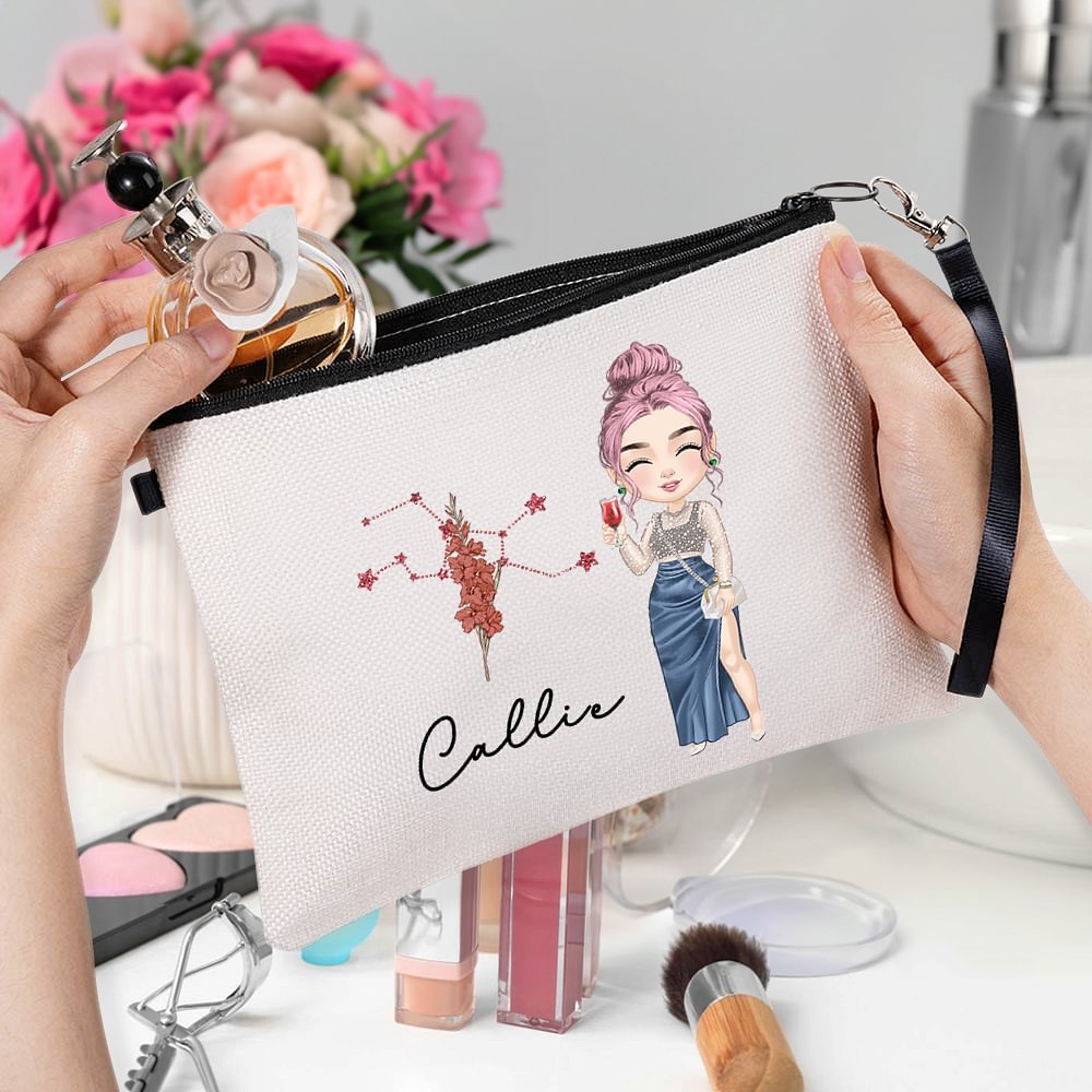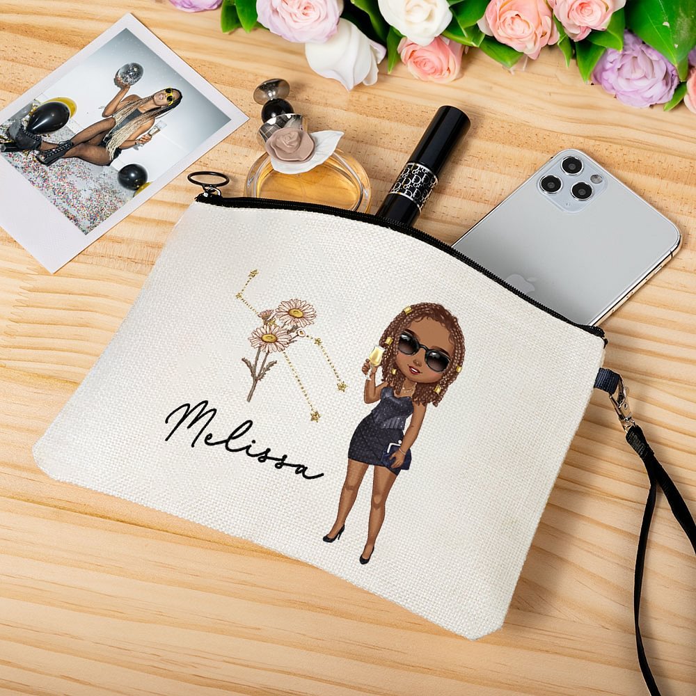 Este neceser de maquillaje presenta una armoniosa mezcla de signos del zodiaco y flores de nacimiento, junto con una encantadora ilustración de un personaje de dibujos animados y un nombre personalizable. Con este neceser podrás mostrar a la perfección tu personalidad y tu gusto por la moda.