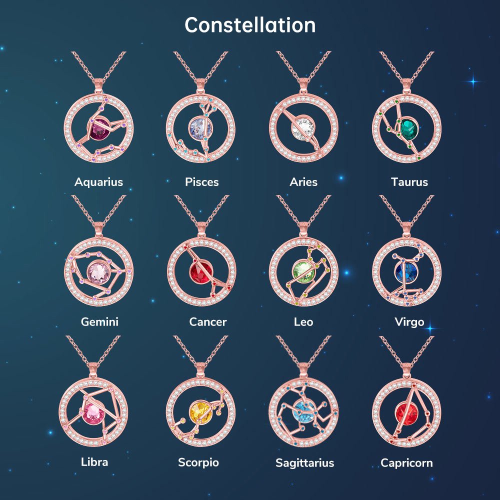 Nuestro collar está hecho con cristales de piedra de nacimiento de primera calidad. Este deslumbrante colgante del zodiaco presenta un diseño único del horóscopo con una estructura en 3D: un aro chapado en oro rosa relleno de circonitas, unido a una línea de estrellas del zodiaco en la parte superior, creando una intensa complejidad estructural que muestra muchas personalidades. ¡La estrella que te pertenece siempre estará contigo cuando lleves este impresionante collar!