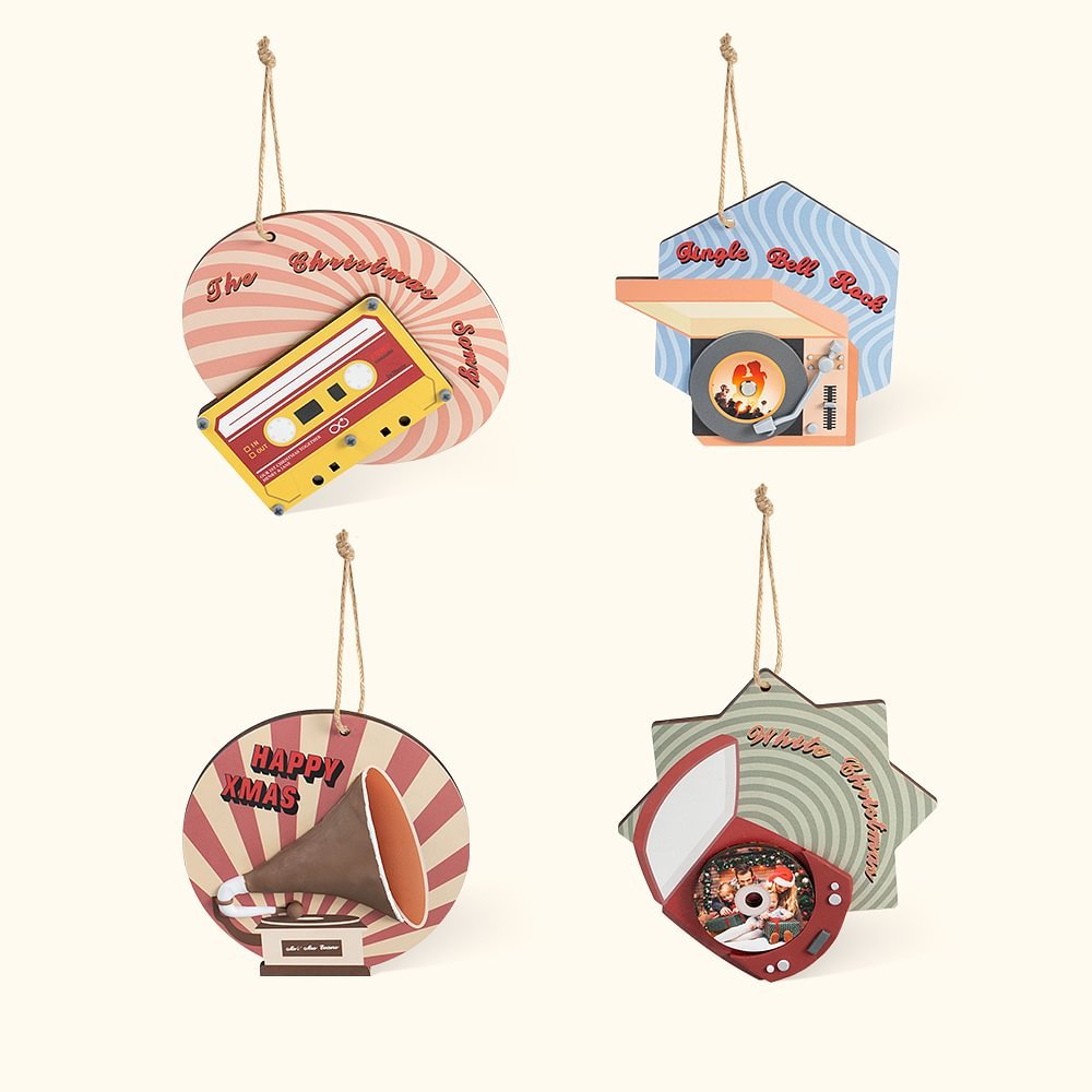 Inspiradas en la historia del desarrollo del medio musical, las cuatro series de productos de adornos navideños están diseñadas y llenas de nostalgia. Cada uno tiene espacio suficiente para personalizar palabras y viene con pegatinas personalizadas para personalizar adornos navideños especiales.